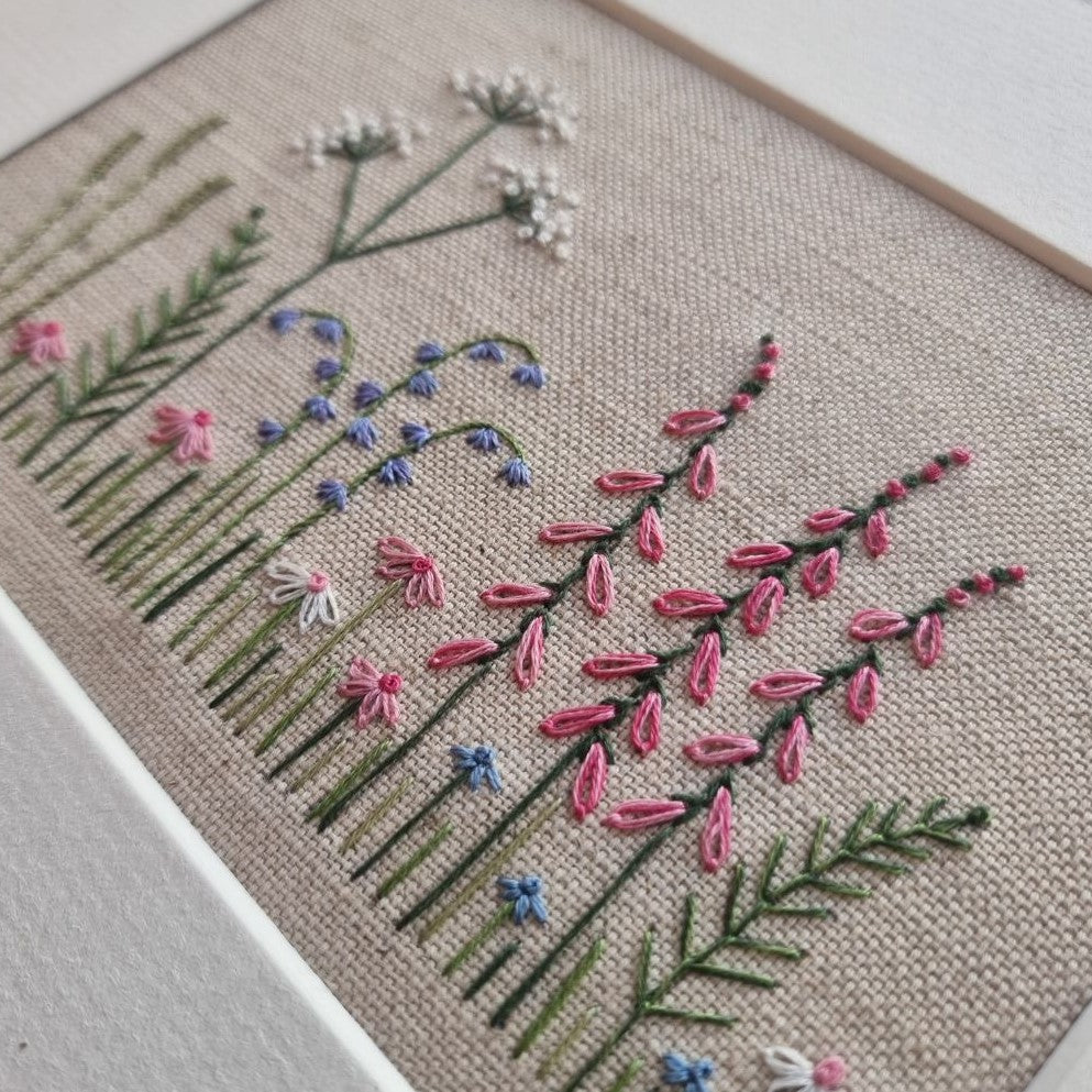 Every embroidered flower border and meadow is meticulously made, starting with her painted watercolour backgrounds, then with each stitch, layers of soft colours and texture are added to create depth and capture her impressionistic style.
