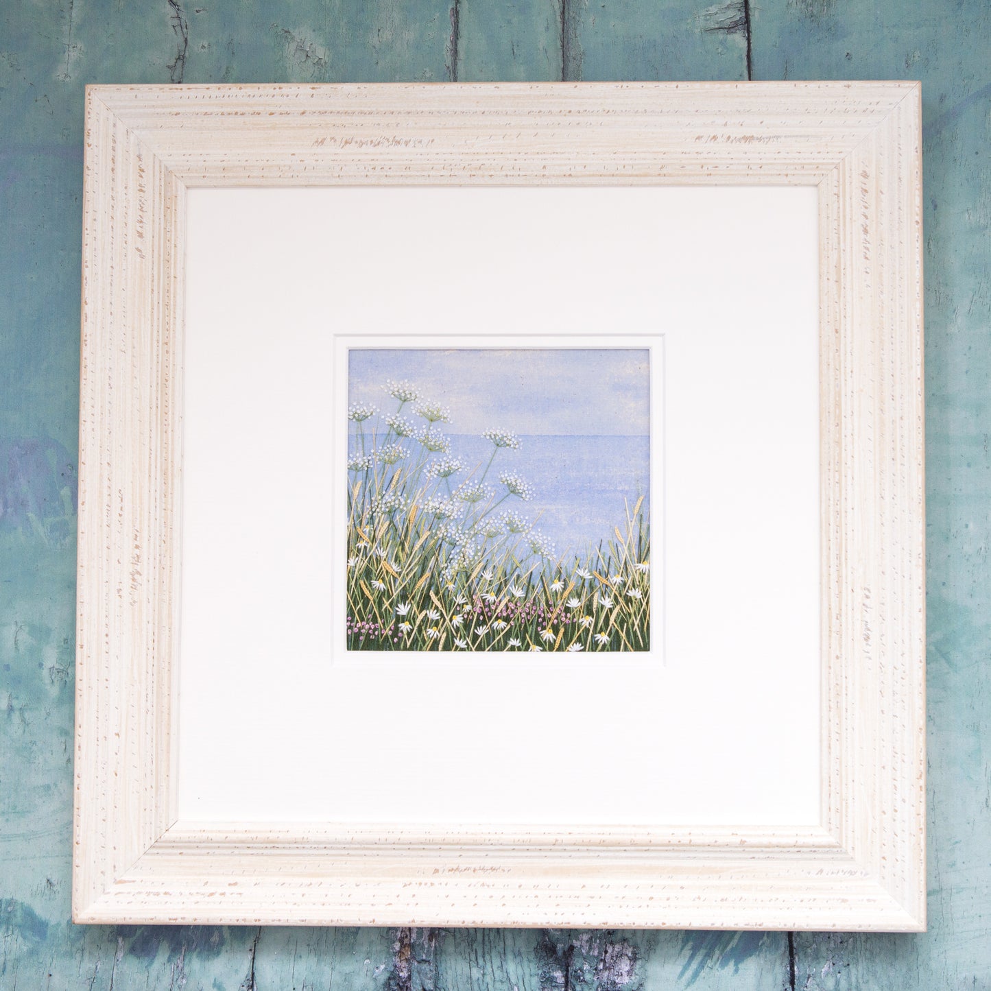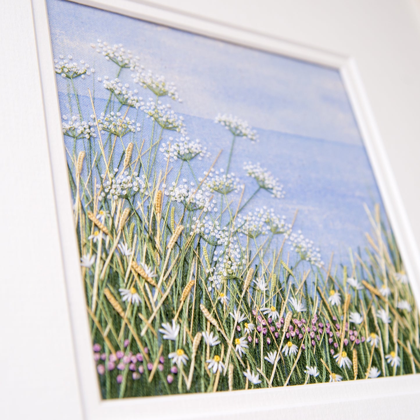 Using a variety of basic stitches, create your own version of this Sea View with cow parsley, grasses, daisies and thrift.