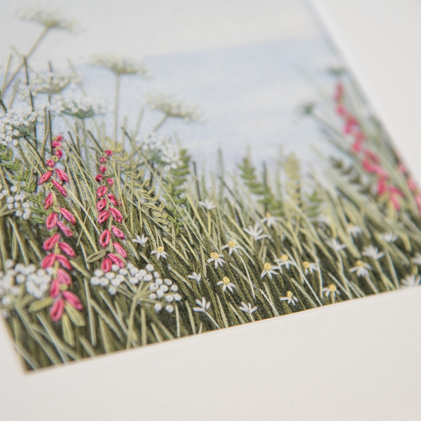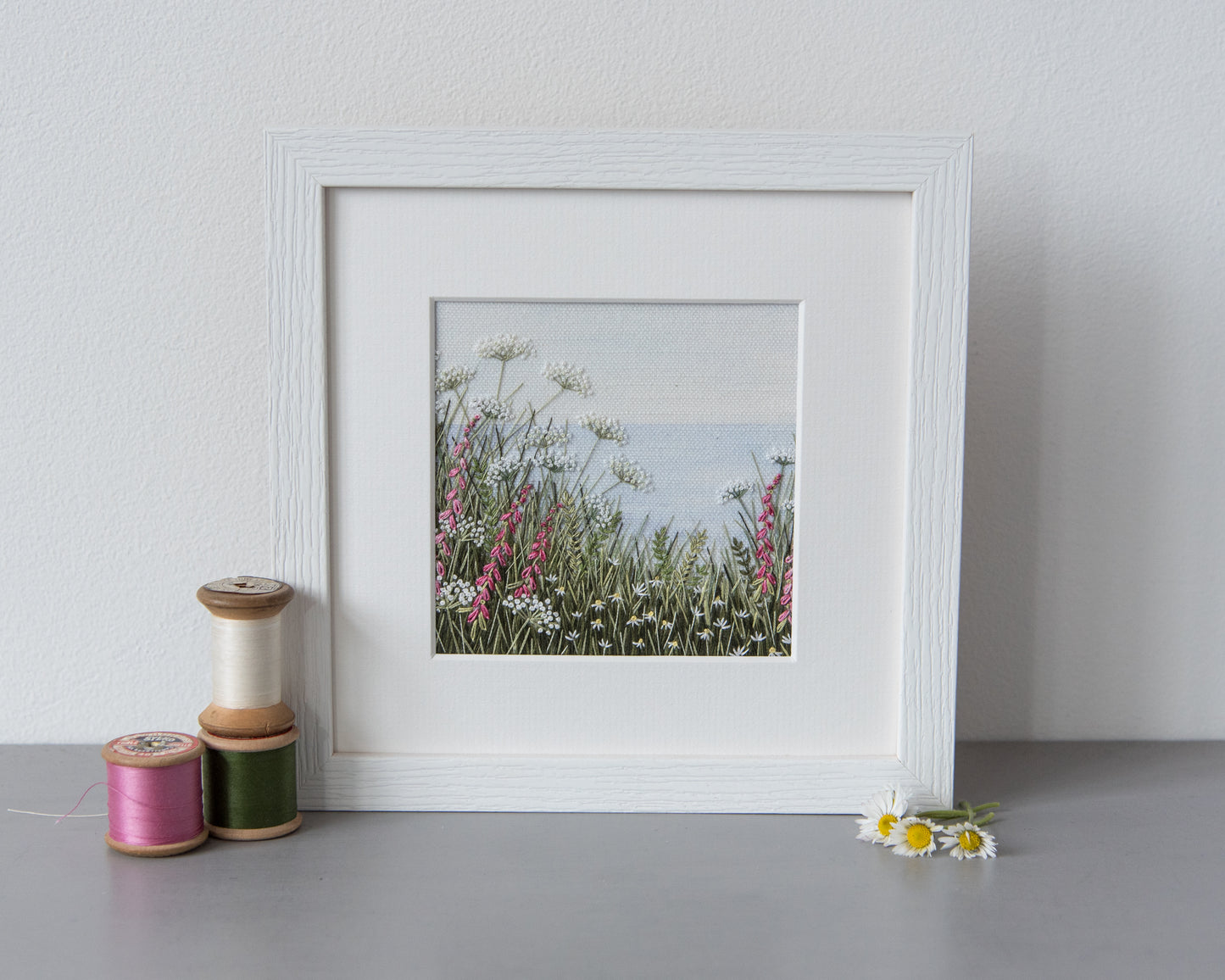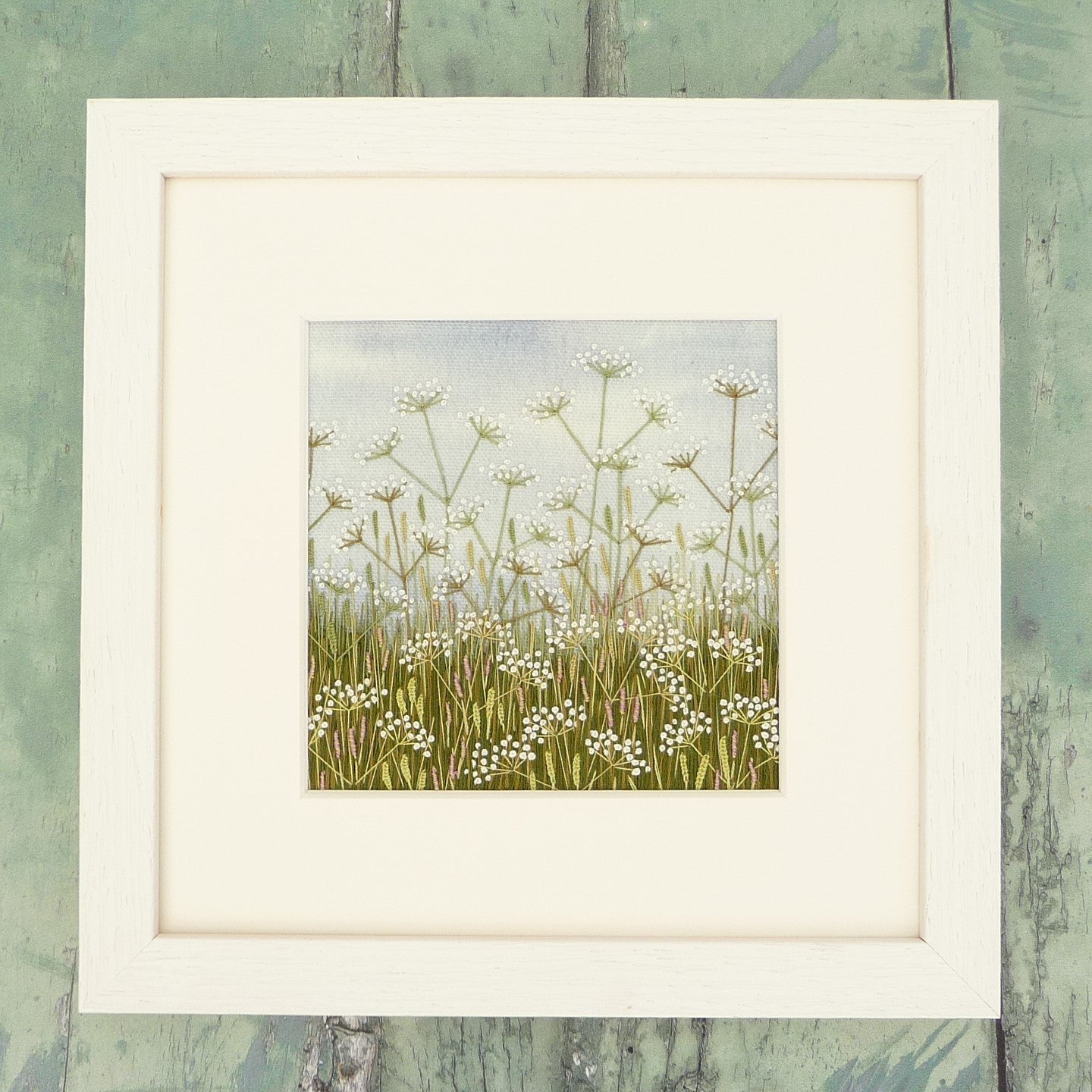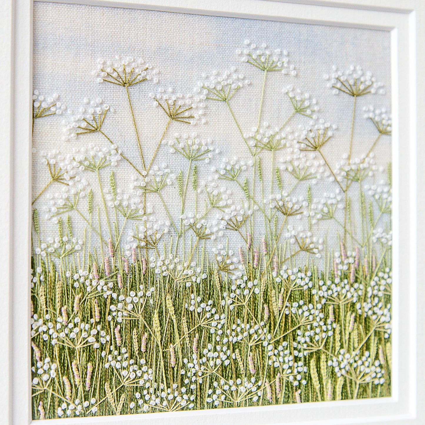 Every embroidered flower border and meadow is meticulously made, starting with her painted watercolour backgrounds, then with each stitch, layers of soft colours and texture are added to create depth and capture her impressionistic style.