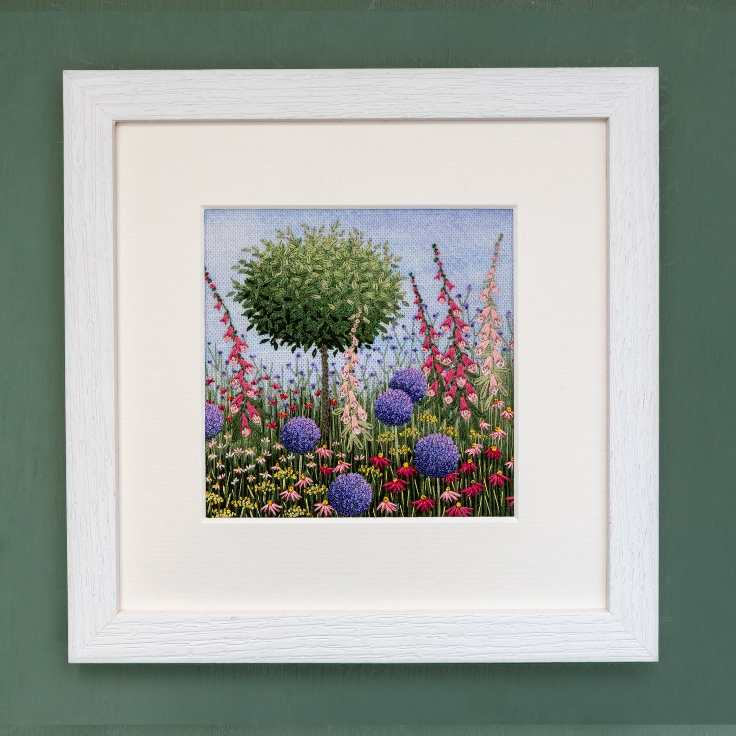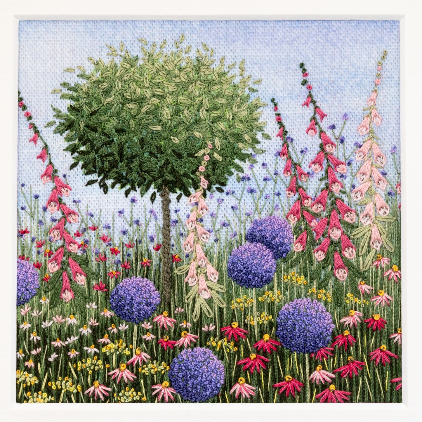 The embroidery kit contains everything required to create this Bay tree with Alliums and Foxgloves artwork.